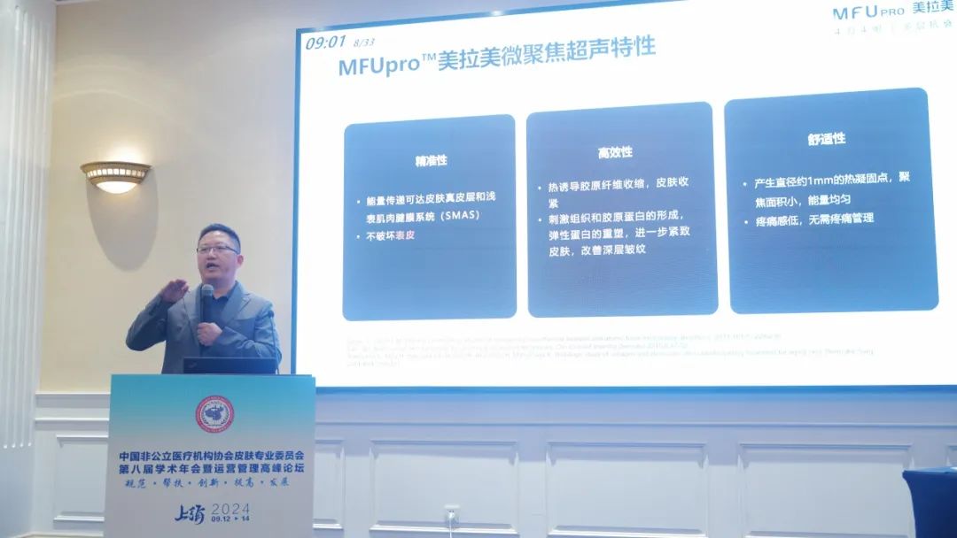 與以往截然不同的是徐輝院長緊扣會議核心主題“規范·幫扶·創新·提高·發展”,重點分析了MFUpro美拉美作為國內首款醫美合規適應癥歐版超聲刀的重要意義。并指出:合規是醫療美容行業的基礎,擁有合規產品的醫美機構才能長久立足于市場,樹立良好的聲譽,構建與消費者的信任關系。