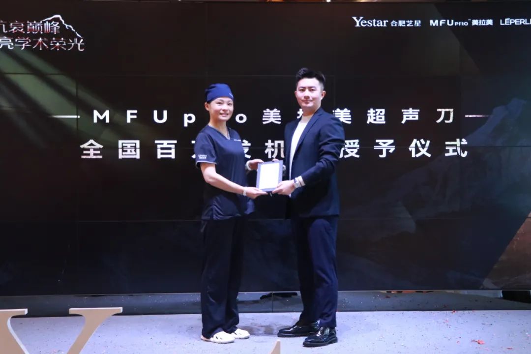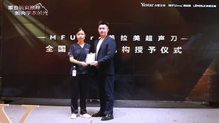 授予儀式上,MFUpro美拉美超聲刀品牌代表將“領(lǐng)耀名星機(jī)構(gòu)”的榮譽(yù)證書(shū)授予合肥藝星及其全體醫(yī)師學(xué)者。