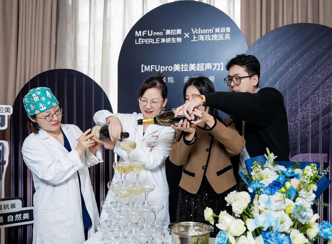 此外,活動以一場精心準備的香檳慶祝儀式達到高潮。上海玫瑰美容皮膚科技術院長陳泳,凈妍生物學術部經理Elaine Zhou、耗材經理孫欽鵬等上海玫瑰醫師一同開啟香檳,慶祝這一重要時刻。