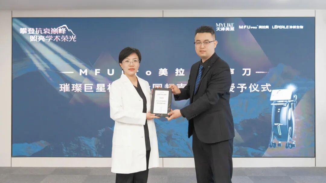 凈妍生物省區經理李彤代表凈妍生物和MFUpro美拉美,將MFUpro美拉美超聲刀“璀璨巨星機構””的榮譽證書授予天津河東美萊。