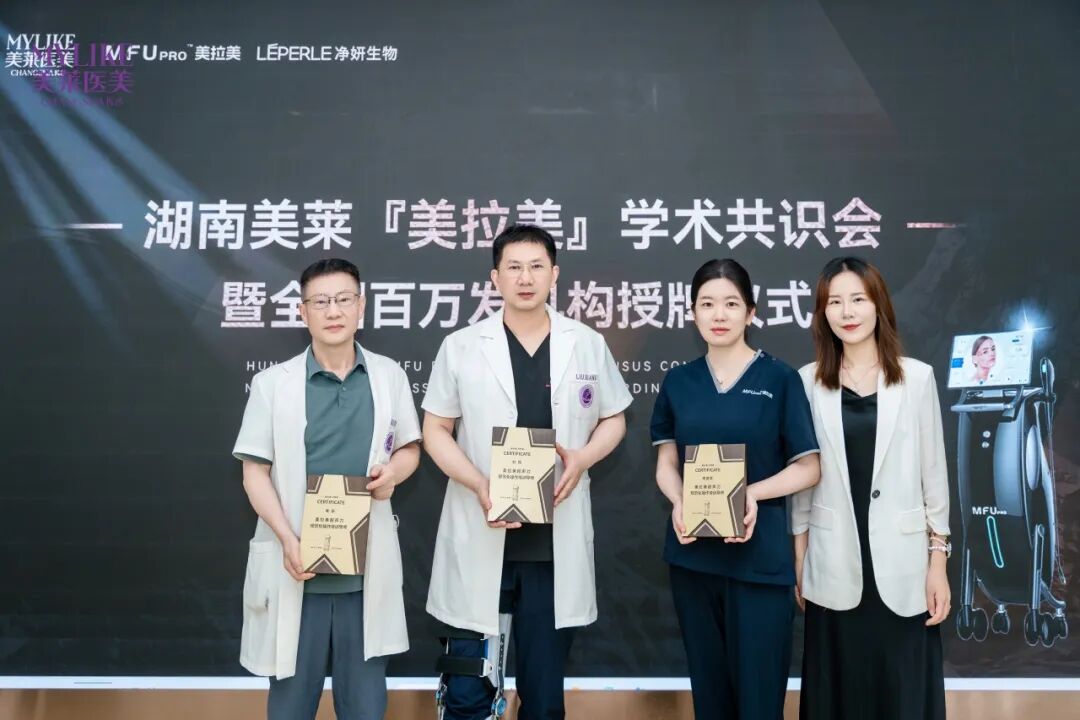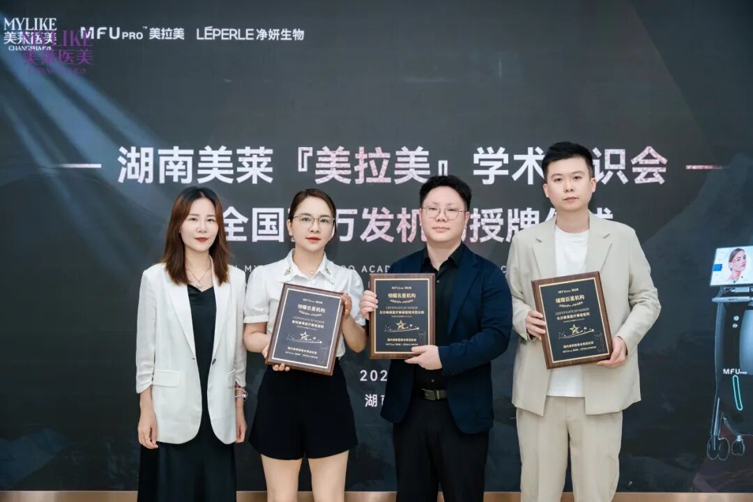與此同時,凈妍生物省區經理劉英代表凈妍生物及MFUpro美拉美超聲刀授予長沙美菜非手術科技術院長何加煒、長沙美萊河西院皮膚院長宋美、衡陽美萊非手術科技術院長胡晗菲、常德美萊皮膚科技術院長林俞君、長沙美萊非手術科周歡主任、長沙美萊非手術科李沛徽醫生、長沙美萊非手術科顏長青醫生多位專家為MFUpro美拉美超聲刀"百萬超級大師”榮譽稱號!