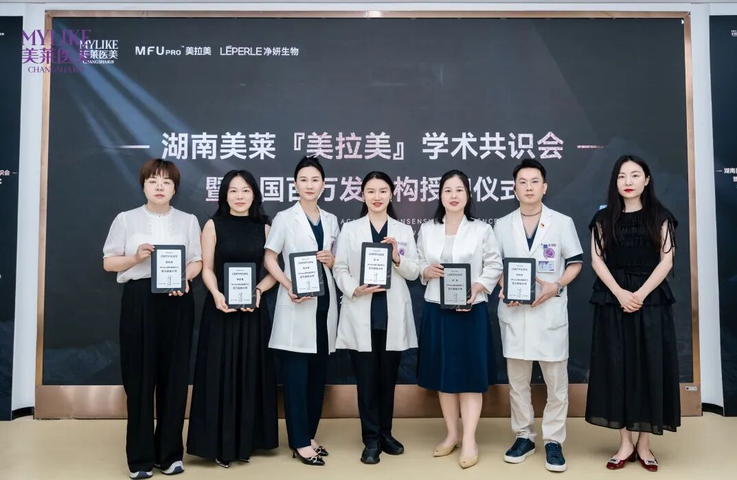 授予儀式,特邀湖南美萊皮膚總顧問、副主任醫師、軍醫博士后麥躍;凈妍生物醫學部負責人Elaine Zhou,省區經理劉英;長沙美萊皮膚科總院長、副主任醫師、博士劉翔;長沙美萊非手術科技術院長李苗苗;長沙美萊河西院皮膚院長、副主任醫師宋美;衡陽美萊非手術科技術院長胡晗菲;常德美萊皮膚科技術院長林俞君等共同出席了本次活動儀式。
