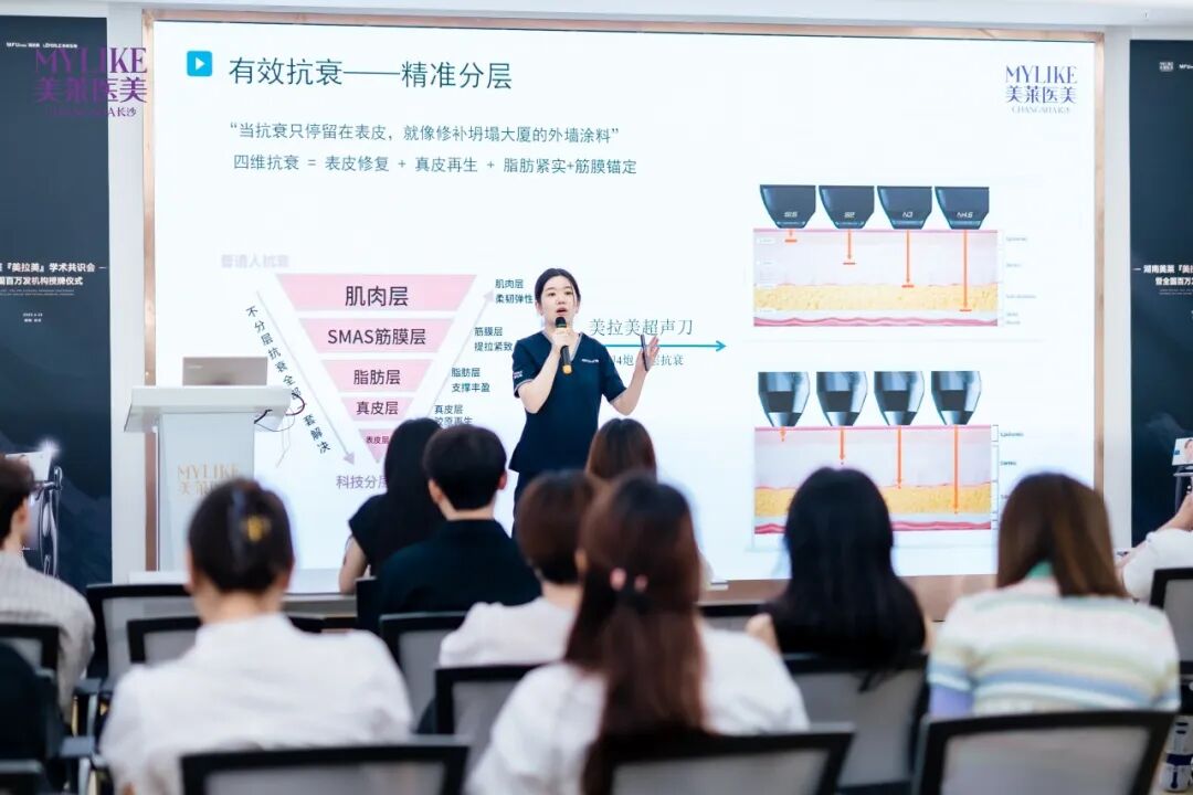 凈妍生物醫學部負責人Elaine Zhou與長沙美萊皮膚總院長劉翔在活動致辭中表示:通過運營與學術的雙向賦能,助力中南地區抗衰市場實現跨越式發展,樹立行業學術新標桿,共同打造“中南抗衰第一品牌”。湖南美萊不僅是湖湘抗衰的領跑者,更是華中地區品質抗衰新紀元的開拓者。此次攜手美拉美超聲刀,將推動從技術領先向醫療規范領先的升級,為本次活動的成功舉辦注入強勁動力!