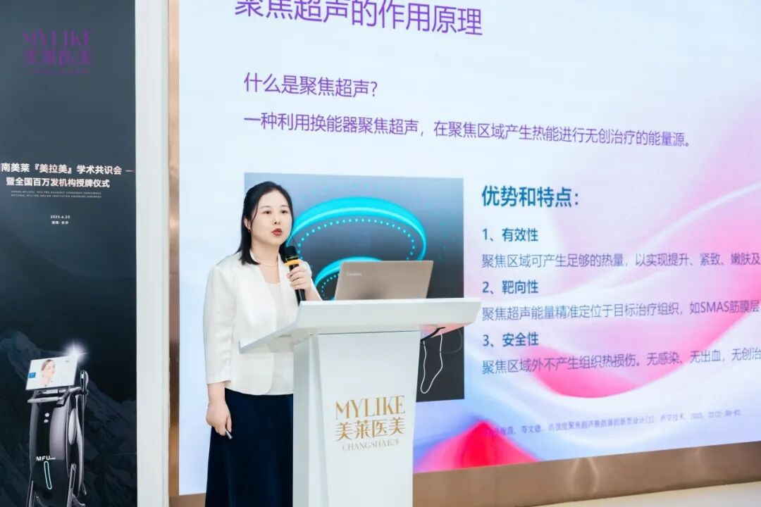 她介紹了美拉美超聲刀不僅是國內首款醫美合規的超聲設備,還采用了新一代微聚焦超聲技術;作為歐版超聲刀,其4刀4炮設計,覆蓋從真皮層到SMAS筋膜層的全面部多層次;特別1.5mm和2.0mm的深度治療有效解決了眼周、口周精細部位的治療難題;此外,美拉美超聲刀在改善“饅化臉”方面效果顯著;以上都說明美拉美超聲刀在臨床應用上具有較強的核心技術優勢。