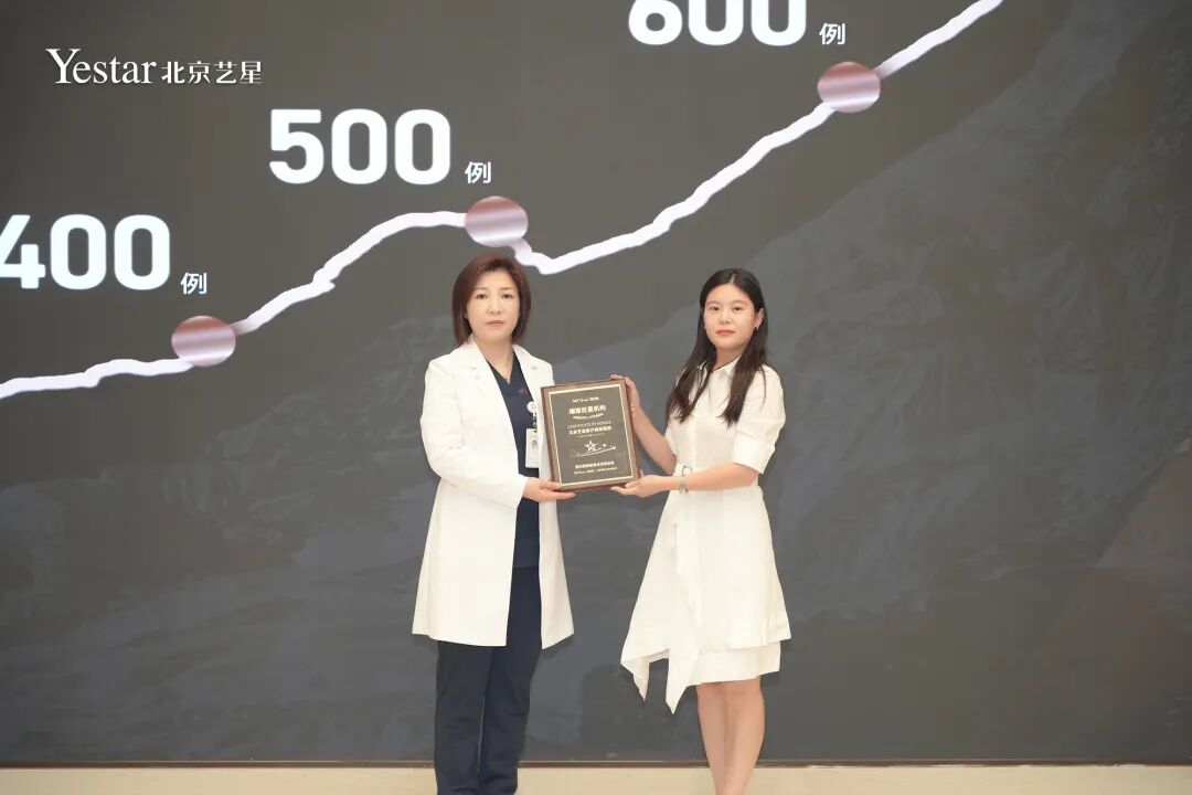 授予儀式上,銷售經理酒雪平;北京藝星皮膚科王丹丹院長、李晶院長、陳雪主任、楊會哲主任、閆靜芬主任、凡千千主任、張繼平醫生、陳亞莉醫生等皮膚科醫師團隊共同出席了本次MFUpro美拉美全國百萬發機構授予儀式。