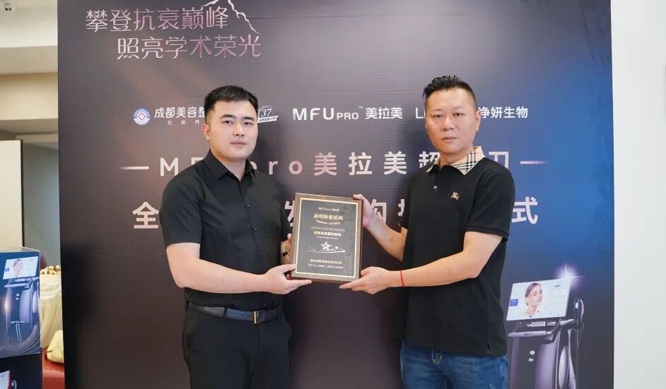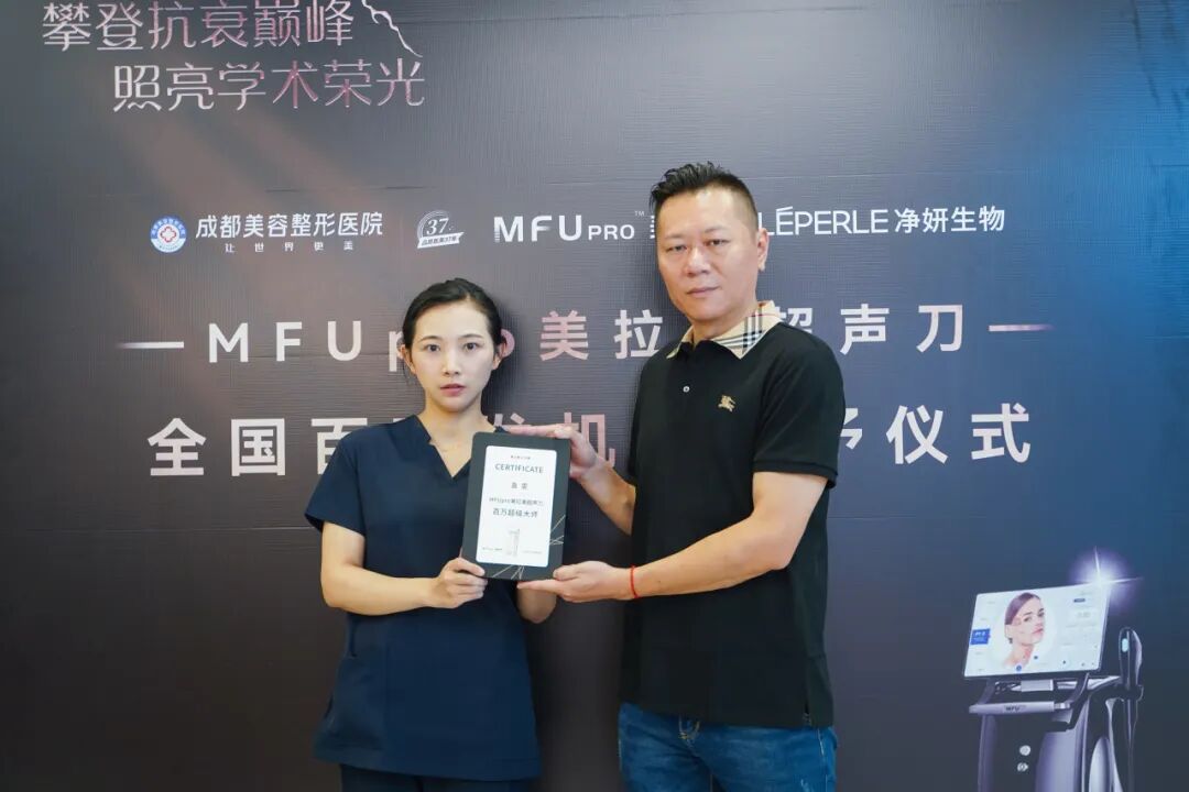 凈妍生物省區經理安永川代表凈妍生物將MFUpro美拉美超聲刀“啟明新星機構”的榮譽證書正式授予成都美容醫院。