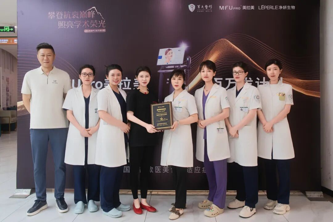 授予儀式上,凈妍生物省區(qū)經理安永川;成都軍大副總唐子茜;皮膚科吳敏院長等皮膚科醫(yī)師團隊共同出席了MFUpro美拉美超聲刀全國百萬發(fā)機構授予儀式。
