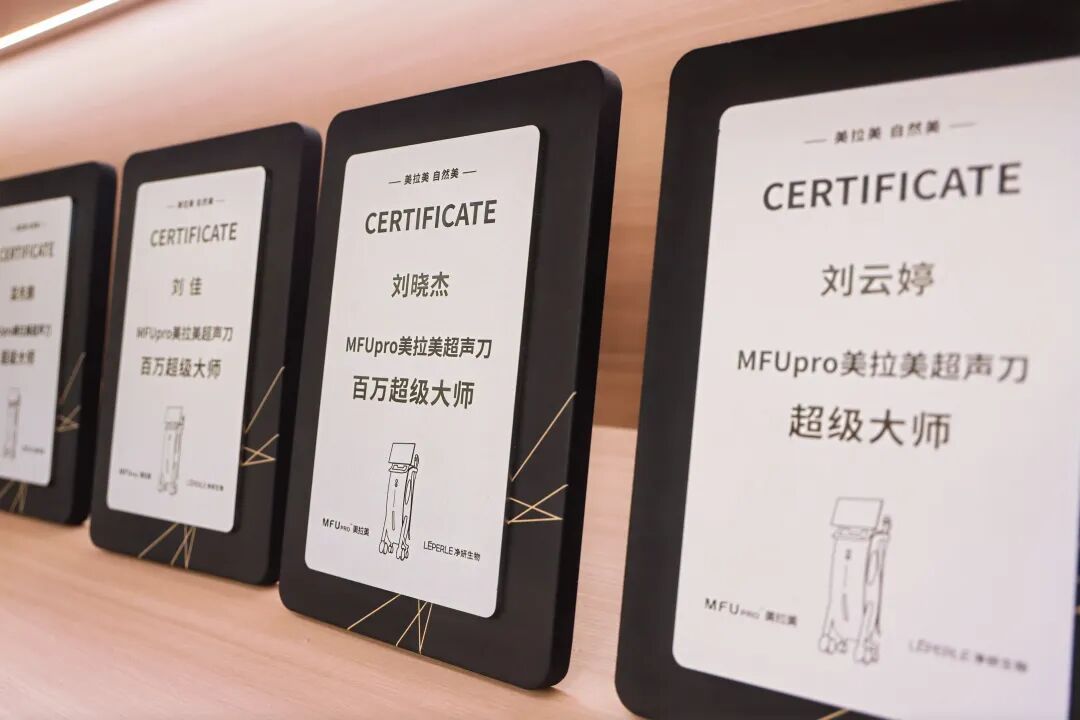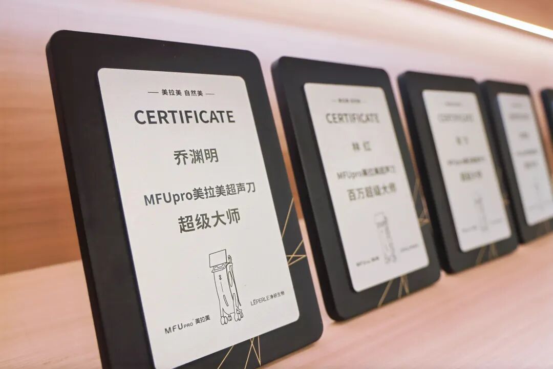 在本次儀式上,青島博士皮膚科劉曉杰、林紅、劉佳三位院長榮獲MFUpro美拉美超聲刀官方授予的“百萬超級大師”榮譽稱號;喬淵明、袁方、段娜、王禛禛、欒先鵬、劉云婷六位醫(yī)師則被授予“超級大師”稱號。