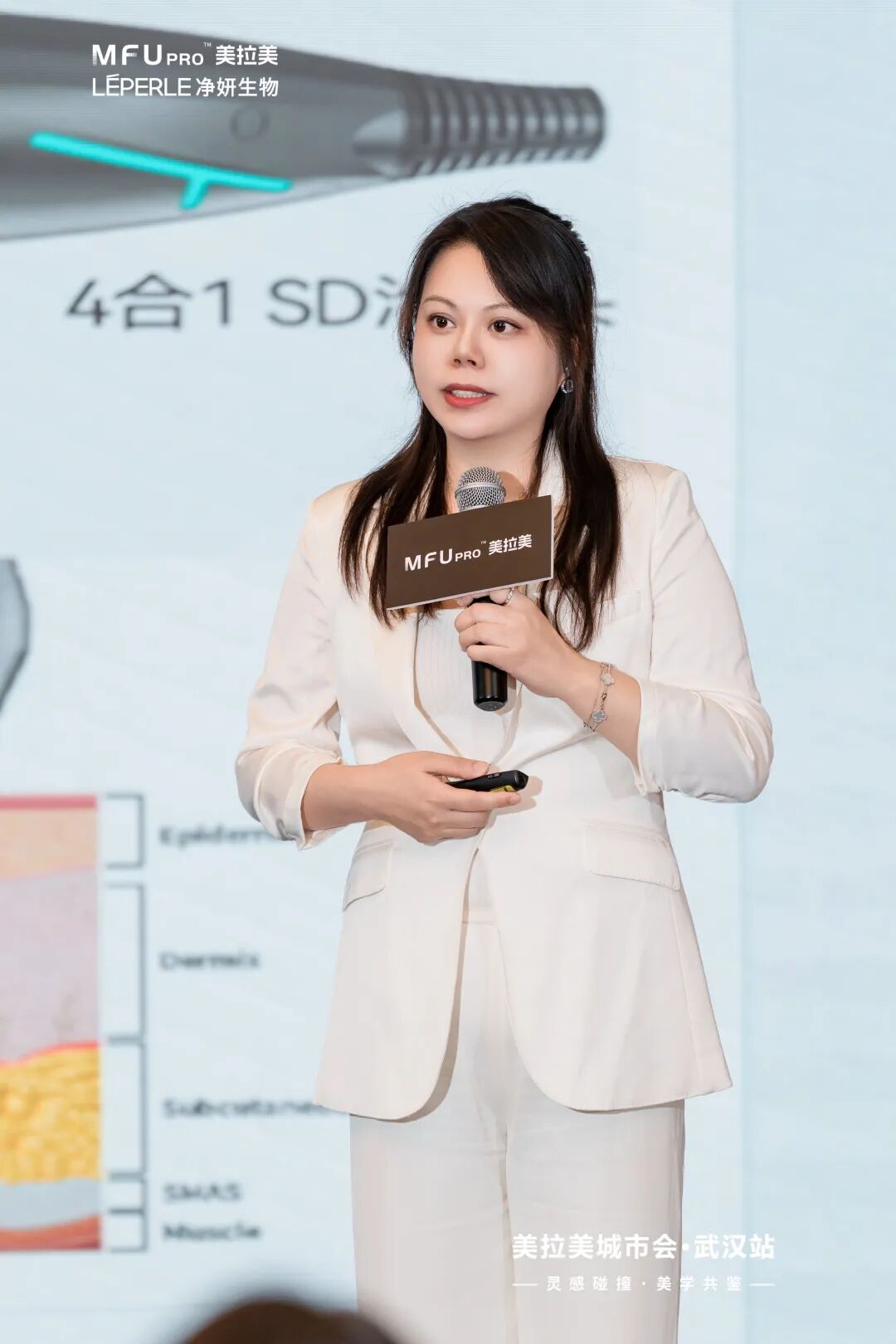 她指出:MFUpro美拉美超聲刀微聚焦超聲技術和特有的4刀4炮可以精準作用于面部不同層次,實現緊致提升,祛除皺紋的抗衰需求。并重點解讀了MFUpro美拉美超聲刀獨特的1.5mm和2.0mm治療頭,不僅有效實現緊致肌膚、改善毛孔粗大和減少細紋皺紋,還能針對炎癥、黃褐斑和黑色素沉積等問題進行輔助治療。展示出MFUpro美拉美超聲刀在抗衰上的擁有卓越表現和廣泛應用潛力。