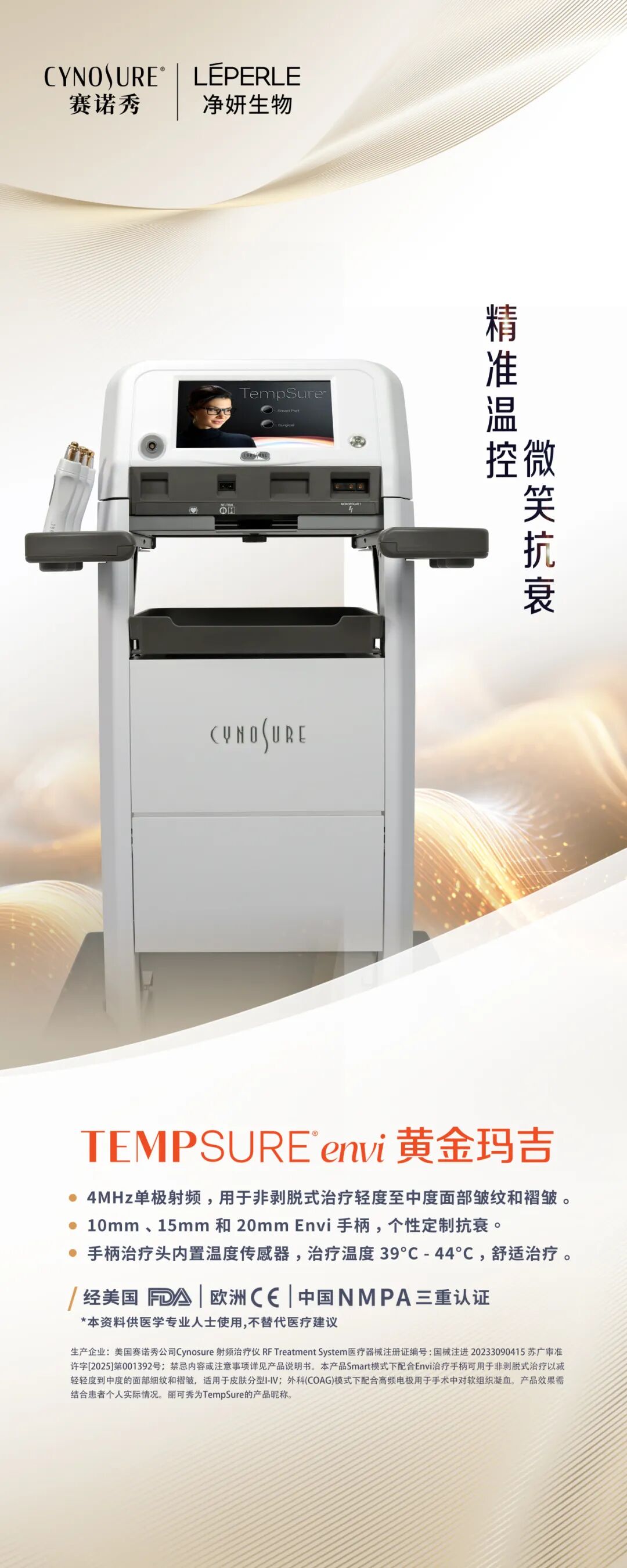 賽諾秀·Tempsure黃金瑪吉是凈妍生物今年推出的重磅新品。它已通過美國FDA、歐洲CE和中國NMPA三重認證,并凝聚了64年的射頻研究精華與專業智慧,是一款革命性的射頻設備。其以獨特的無創舒適技術和顯著的抗衰效果,在市場上享有極高的聲譽。其搭載300W高頻發生器,采用4MHz單極電磁波能量,能在治療過程中將溫度精準控制在39°C至44°C之間。通過深層加熱促進膠原蛋白再生,在確保安全的同時顯著提升療效,從而顯著改善多種衰老問題,為求美者開啟了無創舒適熱瑪吉新時代。