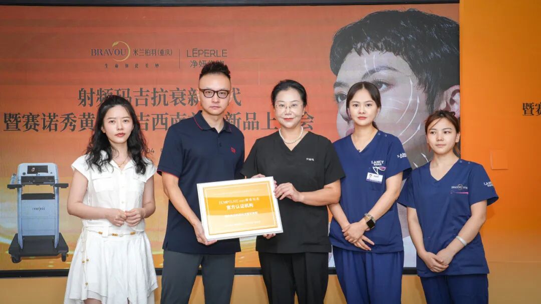 本次新品發布上市會,凈妍生物華中、西南大區總監譚進、客戶經理黃岑岑;重慶米蘭柏羽美容皮膚科運營肖子鈴、美容皮膚科院長尹曉鳴、副院長林麗蓉和劉晏、主任朱德江及重慶米蘭柏羽皮膚科醫生團體共同出席了賽諾秀·Tempsure黃金瑪吉的新品發布活動,一同見證了這一里程碑時刻。