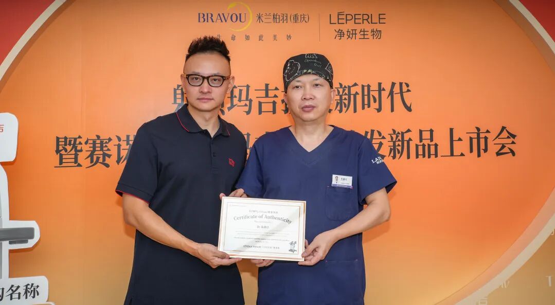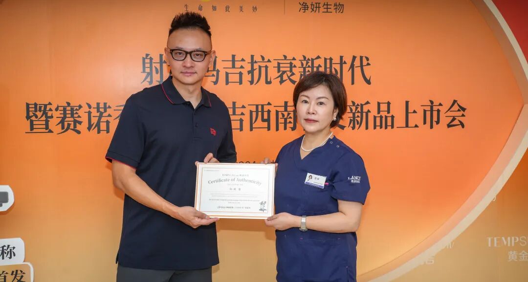 在新品發布上市會上,凈妍生物華中、西南大區總監譚進代表凈妍生物及賽諾秀·Tempsure黃金瑪吉,官方授牌于重慶米蘭柏羽;重慶米蘭柏羽正式成為賽諾秀·Tempsure黃金瑪吉官方權威認證機構,雙方達成戰略合作關系。