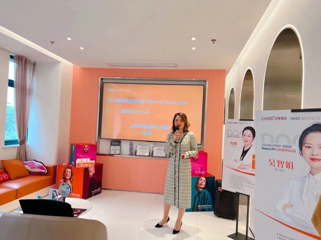 南昌·佳美美容醫院運營院長尹靜瑤致開幕詞;表示出對保柔緹?玻尿酸得認可并預祝此次新品上市及實操應用研討會議圓滿成功!