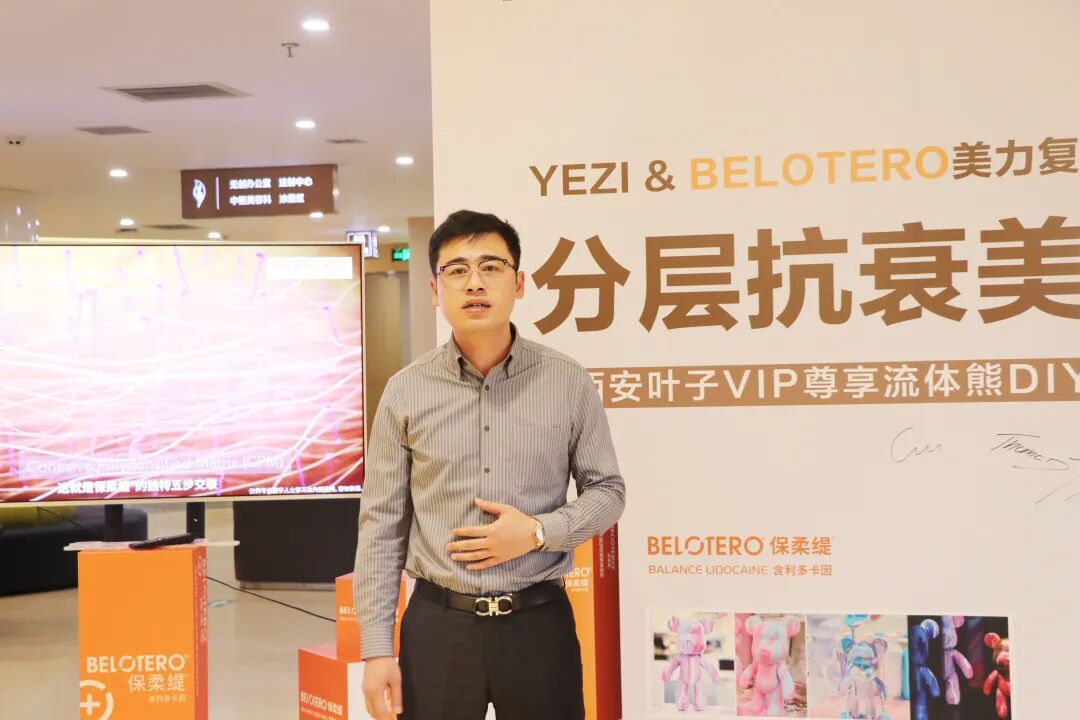 西安葉子醫(yī)療美容醫(yī)院運(yùn)營(yíng)總溫偉軍上臺(tái)發(fā)表BELOTERO保柔緹?新品上市暨分層抗衰美學(xué)品鑒會(huì)活動(dòng)致詞,就高端玻尿酸保柔緹?新品上市西安葉子醫(yī)療美容醫(yī)院充滿信心,并由衷祝福保柔緹玻尿酸新品上市大賣(mài)!