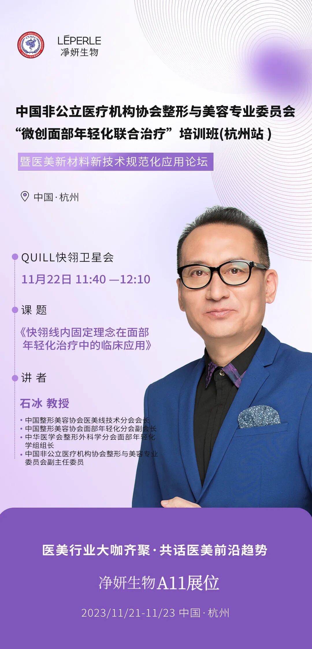 凈妍生物邀請(qǐng)中國(guó)非公立醫(yī)療機(jī)構(gòu)協(xié)會(huì)整形與美容專業(yè)委員會(huì)候任主任委員兼秘書長(zhǎng)、中國(guó)整形美容協(xié)會(huì)醫(yī)美線技術(shù)分會(huì)會(huì)長(zhǎng)、面部年輕化分會(huì)副會(huì)長(zhǎng)石冰教授作為美國(guó)QUILL?快翎內(nèi)固定輪廓抗衰美學(xué)大會(huì)的特邀嘉賓。