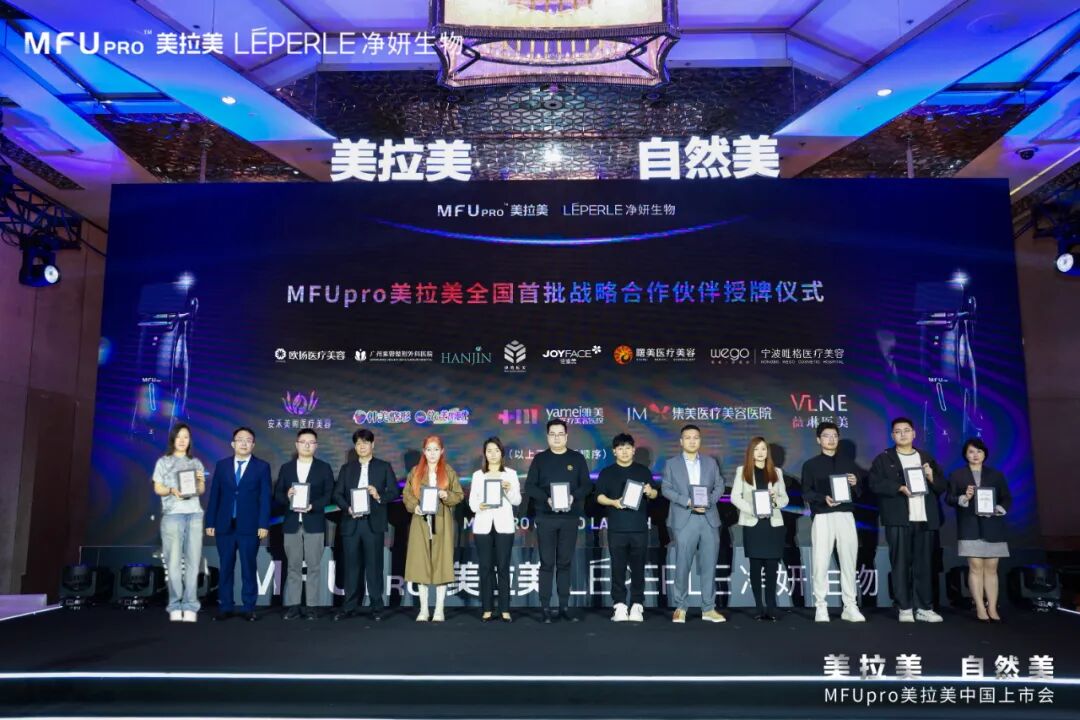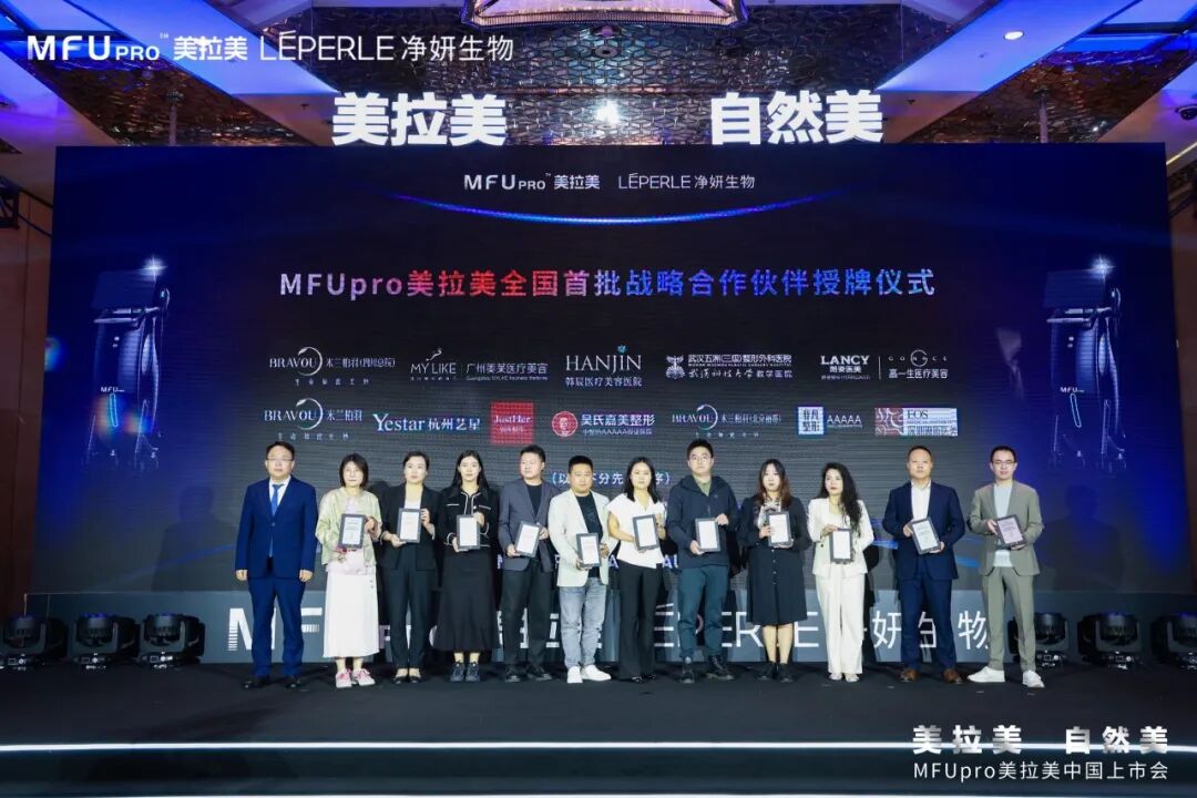 現(xiàn)場(chǎng),MFUpro美拉美品牌與首批25家戰(zhàn)略合作伙伴們逐一登臺(tái),并授予象征著緊密合作與共同發(fā)展的官方授牌。此舉承載著雙方對(duì)未來(lái)市場(chǎng)布局的高度共識(shí),也代表了MFUpro美拉美與合作伙伴間的深度互信與戰(zhàn)略合作關(guān)系,更預(yù)示著MFUpro美拉美將以更加開(kāi)放的姿態(tài),攜手各戰(zhàn)略伙伴一同開(kāi)拓中國(guó)醫(yī)美市場(chǎng)的新藍(lán)海,推動(dòng)行業(yè)標(biāo)準(zhǔn)升級(jí),共創(chuàng)共贏!